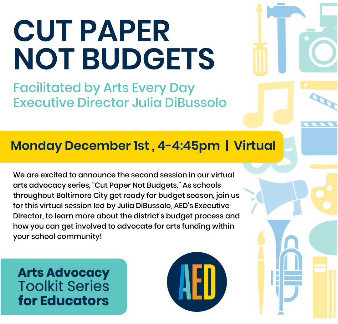 We are excited to announce the second session in our virtual arts advocacy series, “Cut Paper Not Budgets.” As schools throughout Baltimore City get ready for budget season, join us for this virtual session led by Julia DiBussolo, AED’s Executive Director, to learn more about the district’s budget process and how you can get involved to advocate for arts funding within your school community!