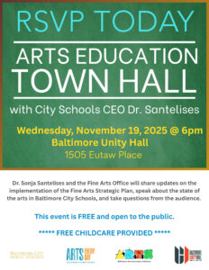 Educators, Parents, Students, and Community Members! Please join us for a Town Hall event November 19, 2025 at 6pm at Baltimore Unity Hall (1505 Eutaw Place) focused on arts education in Baltimore City Public Schools. Get the latest updates about Baltimore City’s Fine Arts Strategic Plan and see what access ti arts education looks like across the district with Baltimore City Public Schools CEO- Dr. Santelises, plus hear testimonies from Parents, Students, and BCPSS Alums.