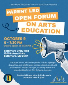 Hosted by: Baltimore Advocates for Arts Education (BA4AE)—a collective of parents, caregivers, and community members working to ensure every child has access to high-quality, equitable arts education.