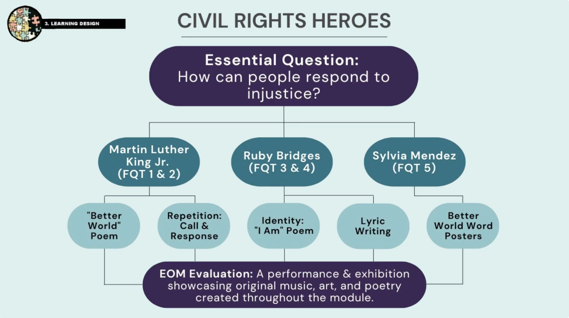 - Students will have the opportunity to create music, art, and poetry in relation to the focusing question arcs of the module