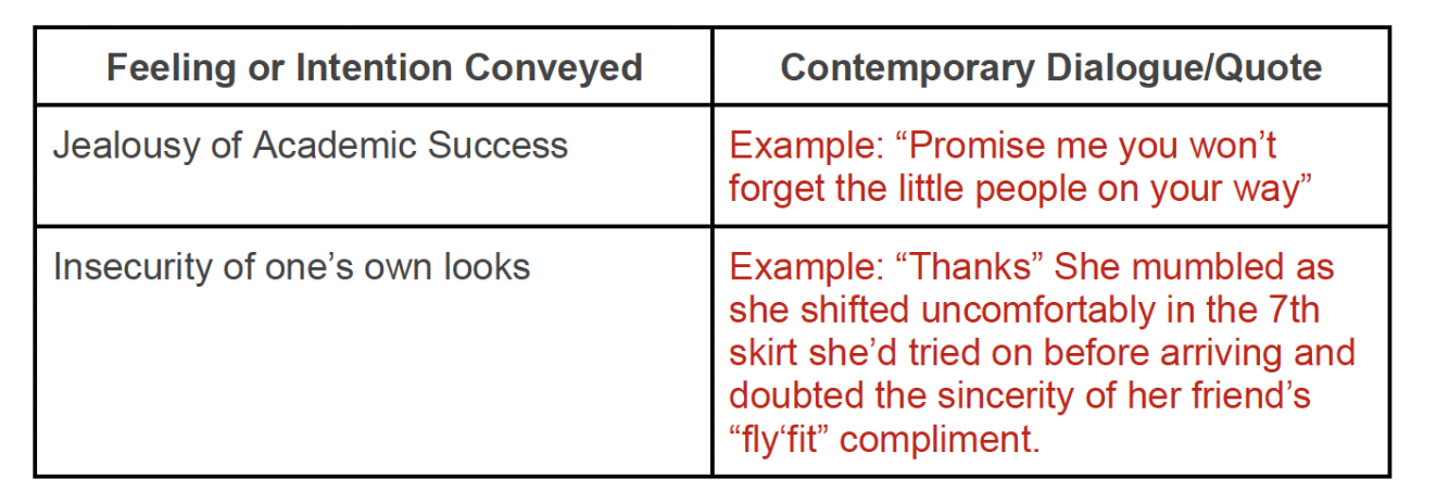 Reminder: Because this chapter, especially the recommended confrontation scene, is lengthy, let students know they aren’t expected recreate or rewrite the dialogue line by line, and that they might accomplish the same effect appropriate for their contemporary version by a simple stage direction