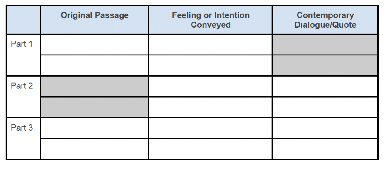 Part #3) The last chart involves all three components as a progression and this will help build up to the desired objective of creating a contemporary version of the script for specific passages from the chapter. You may even want to use this 3 column chart for all steps and just shade or cross out the boxes that you’re not looking for responses in. See below for examples.